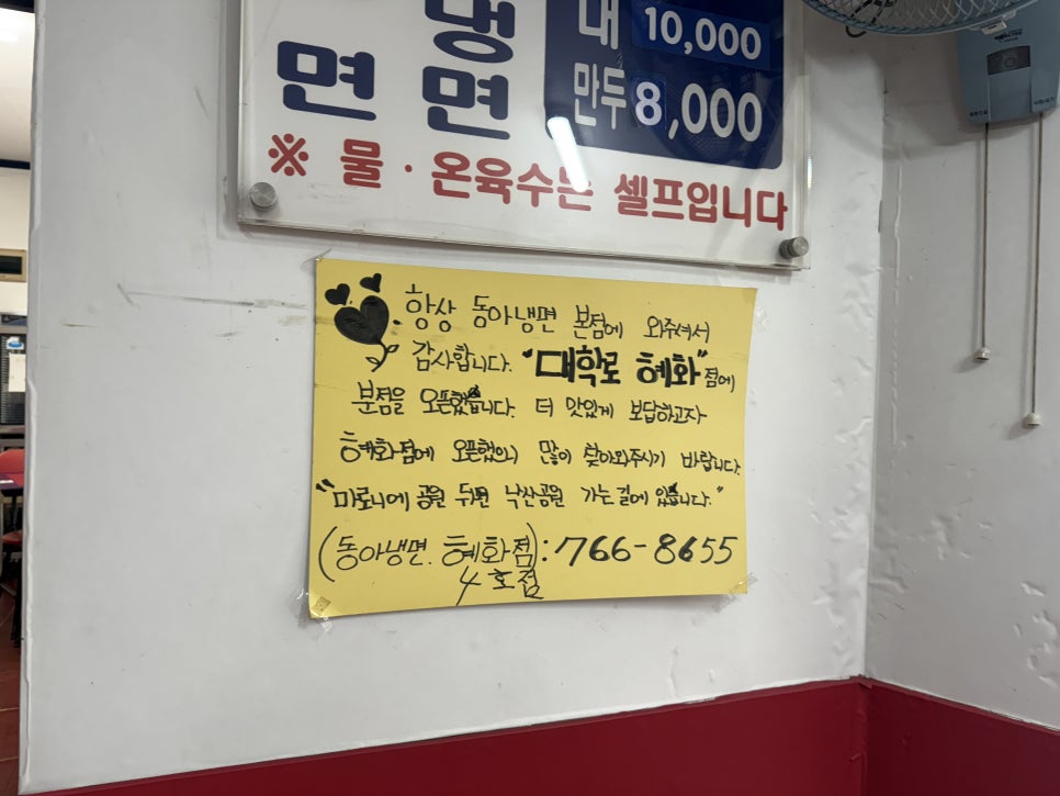 🧾 종합 평가 동아냉면 본점은 매운 냉면과 깊은 맛의 온육수로 많은 사람들의 사랑을 받고 있는 맛집입니다. 매운 음식을 좋아하는 분들에게는 강력히 추천할 만한 곳이며, 온육수의 깊은 맛은 매운맛을 중화시켜주는 역할을 합니다. 다만, 주차 공간이 부족하고 매운맛이 강하다는 점은 고려해야 할 부분입니다. 전반적으로 합리적인 가격과 독특한 맛으로 한 번쯤 방문해볼 가치가 있는 곳입니다.